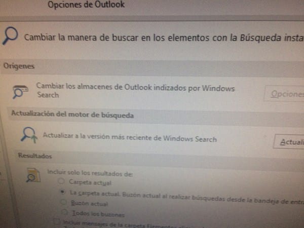 Además si entro en Outlook al menú Archivo, opciones, búsqueda me indica que debo actualizar el motor de búsqueda Windows Search