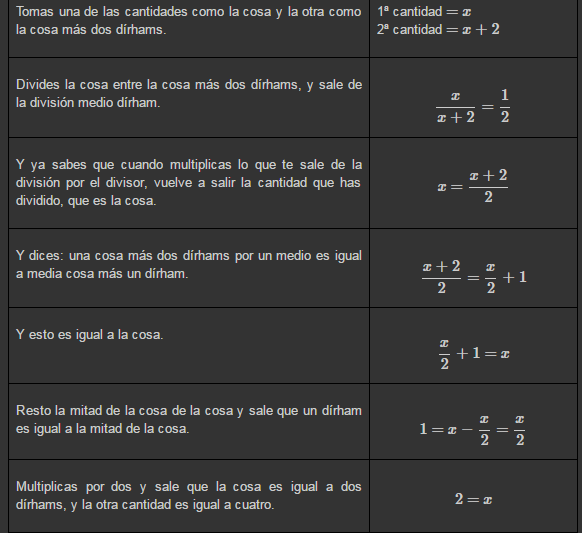 A continuación voy a poner un problema en álgebra retórica con su traducción al álgebra simbólica que usamos hoy en día, el problema es original del libro de al-Jwa¯¯¯rizmi¯, y lo he extraído de (Durán, 2012): "Calcular dos cantidades, la diferencia entre ella es de dos dirhams, y al dividir la menor entre la mayor sale medio dirham". En la siguiente tabla, en la columna de la izquierda se incluye la solución tal y como la explicó al-Jwa¯¯¯rizmi¯, mientras que en la columna de la derecha aparece su traducción usando álgebra simbólica: