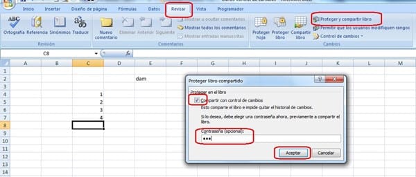 2. En la ventana Proteger libro compartido, marca la casilla "Compartir con control de cambios". Escribe una contraseña y presiona Aceptar. En la siguiente ventana repite la contraseña y Aceptar. En la ventana "Esta acción guardará el libro" presiona Aceptar.