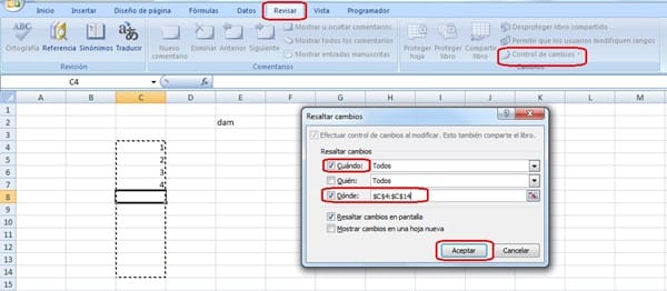 4. En la ventana Resaltar cambios, en el campo Cuándo selecciona "Todos". Activa el campo Dónde y en el campo escribe o selecciona las celdas que estarán controladas. En mi ejemplo puse de la celda C4 hasta la celda C14. Presiona Aceptar