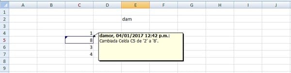 5. Ahora, cuando modifiques una celda dentro del rango C4 a D14, la celda quedará enmarcada de color azul y cuando acerques el mouse a la esquina resaltada en azul, te mostrará la información sobre el cambio, Quien la modificó, la fecha, la hora, el valor anterior y el valor nuevo: