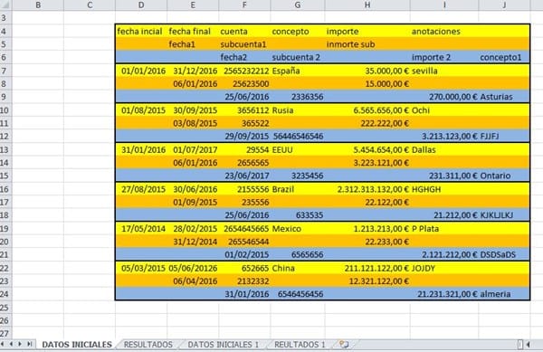 Tengo estos posibles datos, porgo dos ejemplos de datos, pero la disposición de ellos puede ser variable, como podéis ver en los dos ejemplos pueden ser distintos. Los datos salen de la siguiente manera los encabezados en dos, tres o cuatro filas (tampoco se sabe su numero de columnas y su posición)y sus datos correspondientes salen en grupos de filas (grupos de dos, tres, cuatro filas) en la misma disposición que los encabezados.