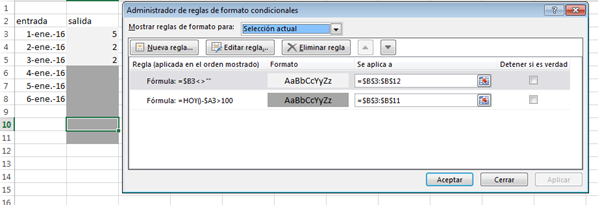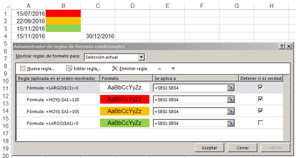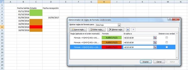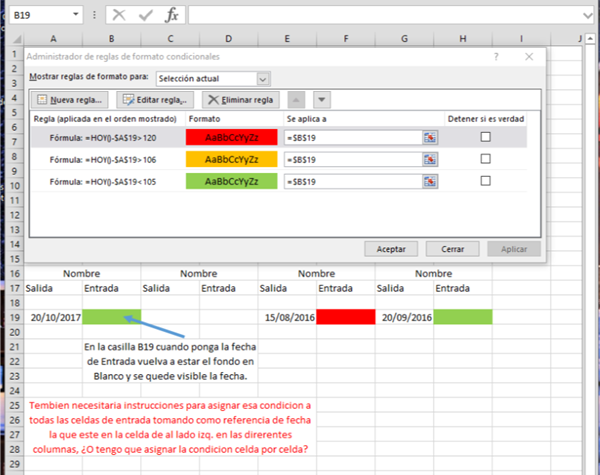 Tengo en la celda A1 una fecha de salida de un producto que me tienen que devolver en un máximo de 120 días, he logrado, con algunas indicaciones vuestras de este foro y a base de probar que se ponga la celda de al lado B1, en verde durante los siguientes 105 días, en naranja durante los días 106 a 120 y en rojo pasados los 120 días, pero ahora me queda solucionar que se vuelva a poner la celda (B1) en blanco cuando le pongo la fecha de recepción, sea cual sea esa fecha, es decir antes o después de los 120 días que tengo como limite para recibir de vuelta el producto.