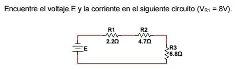 Encontrar el voltaje E y la corriente en el siguiente circuito. Les agradezco su ayuda y espero que me puedan explicar paso a paso la resolución del problema.