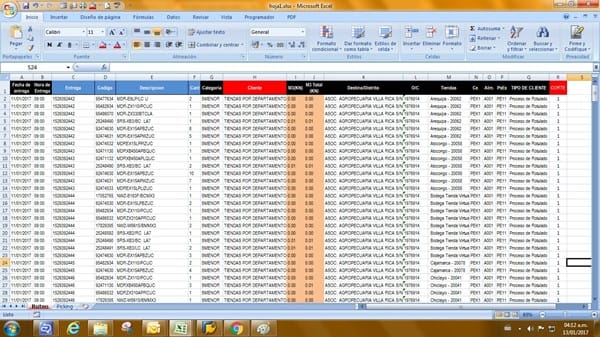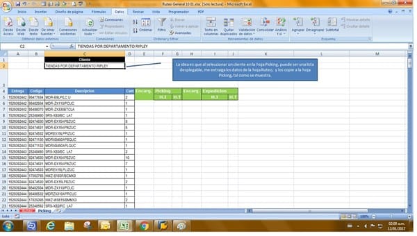 2.- El tema es que almacén imprime hojas de Picking por cliente, y copia los datos de manera manual a la otra hoja del libro llamada "Picking". Es decir, en la hoja Ruteo filtra un cliente, por ejemplo Tiendas por Departamento Ripley, y los datos resaltados en celeste los pasa a la hoja Picking para que puedan imprimirlos.