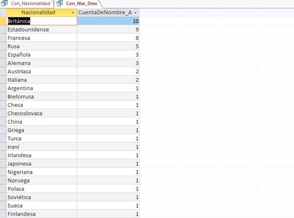 Pero lo que yo quiero es que se ordenen de mayor a menor según las veces que aparece cada Nacionalidad, es decir, que aparezca en primer lugar la nacionalidad que se repite más veces, etc. Para realizar esta consulta, he llegado hasta donde veis en la imagen: