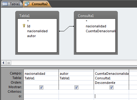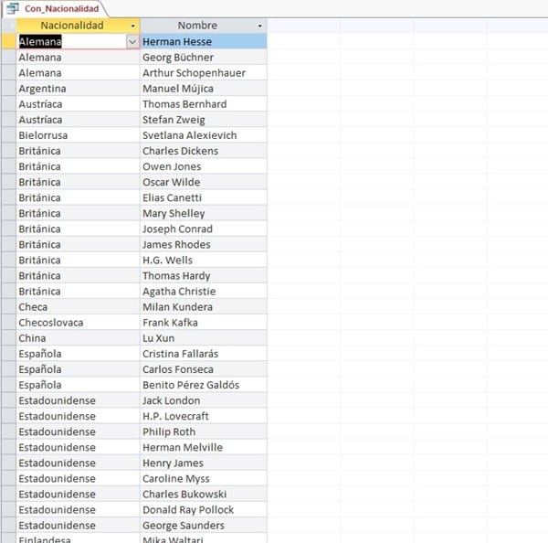 Quiero realizar una consulta en la que se muestren los autores según su nacionalidad. Como veis, en la imagen, la consulta se me ordena por el campo Nacionalidad_Autor en orden ascendente alfabéticamente.