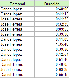 Selecciona la hoja donde tienes todo el listado, selecciona la columna de los nombres del personal y a continuación punto y coma ( ; ) o como. A continuación regresa a la hoja donde tienes el listado sin los duplicados y clic en el primer nombre de la lista. A continuación punto y coma. A continuación de nuevo a la hoja con el listado completo seleccionas la columna con las horas. Cierra paréntesis y ENTER.