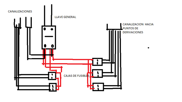 Como pueden ver, este es un esquema del tablero,(no dibuje todas las cajas de fusibles) pero consta de un interruptor termomagnético general de 25 A que es alimentado del cuarto de contadores que esta en el subsuelo, (el icp al lado del contador es de 16 A), LA LLAVE GENERAL se conecta a las cajas de fusibles del tablero, las cuales alimentan las luces y tomacorrientes( con los cables en rojos).