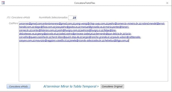 Private Sub BtnCadenaTo_Click() 'Código Jacinto Trillo Jareño, para probar una respuesta que dí en Todoexpertos en Fecha 14/01/2017, y otra el 16/01/2017 'http://www.todoexpertos.com/preguntas/7ji3dl7wet3ipxjc/unir-varios-campos-para-crear-uno-solo-para-envio-de-emails-multiples 'http://www.todoexpertos.com/preguntas/7jnwmnhhgmek7sw5/seleccionar-todos-los-correos-de-un-formulario-de-clientes?selectedanswerid=7jnxges76v69ok9x&nid=9ou9rtugggoq9t6fgstplg4qh3w6dhkqgcrprg4ohovpntmi9su9xx6fabr3&utm_source=todoexpertos&utm_medium=EmailNotification&utm_campaign=ExpertAnswer_AskerMessageAdded Dim StrSQL As String, LaListaEMails As String Dim NumMails As Integer Dim Rst As DAO.Recordset LaListaEMails = "" Me.TxtTo = "" NumMails = 0 Me.TxtNumMails = 0 StrSQL = "SELECT Correo, Enviar FROM TblClientes WHERE Enviar = True" Set Rst = CurrentDb.OpenRecordset(StrSQL, dbOpenSnapshot) If Not Rst.EOF And Not Rst.BOF Then Rst.MoveLast Rst.MoveFirst Do While Not Rst.EOF LaListaEMails = LaListaEMails & Trim(Rst!Correo) & ";" NumMails = NumMails + 1 Rst.MoveNext Loop LaListaEMails = Left(LaListaEMails, Len(LaListaEMails) - 1) Me.TxtTo = LaListaEMails Me.TxtNumMails = NumMails Else MsgBox "Este Recordset está vacío", vbCritical, "RECORDSET SIN DATOS" End If Rst.Close Set Rst = Nothing End Sub