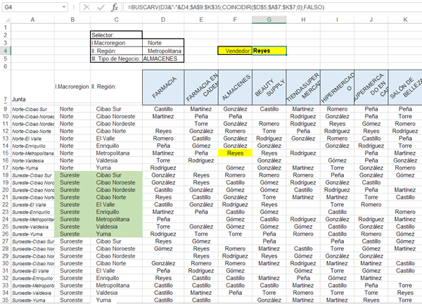 En la parte superior del cuadro están los selectores para buscar qué vendedor corresponde. También podrían estar organizados en columnas si tuvieras que hacer una búsqueda de un listado de combinaciones.