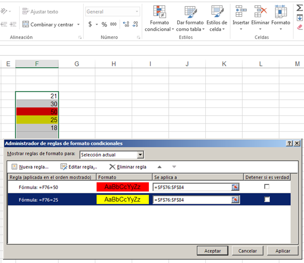 Notarás que se agrega arriba de la regla anterior. Tendras que moverla abajo con los botones que te marco en amarillo. También es importante que marques Detener si es verdad para que no siga evaluando la condición siguiente.