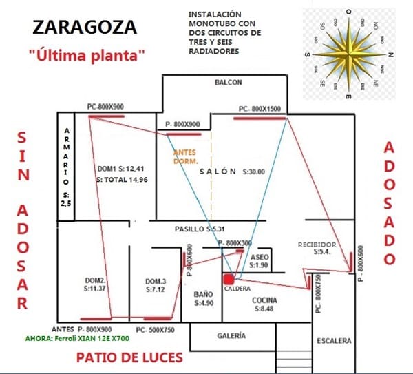Muchas gracias por tu interés. Te mando el croquis de la vivienda con lo que hay. Decirte también que con el cambio de radiadores conllevaría el cambio de válvulas, pues alguna ya empieza a perder al tocarlas, oigo hablar últimamente de la conveniencia de poner termostáticas en busca de confor y ahorro. Si me lo recomiendas ¿cuales me aconsejas?