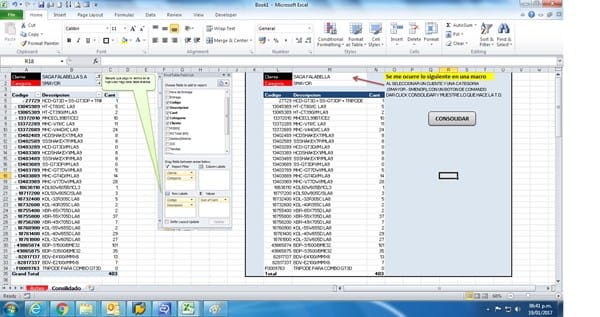 Mi idea es que una macro haga esa tarea ya que que es un proceso repetitivo para almacén donde trabajo, es decir pego mi base de datos y con un botón consolidar muestre lo que se hace con tabla dinámica.