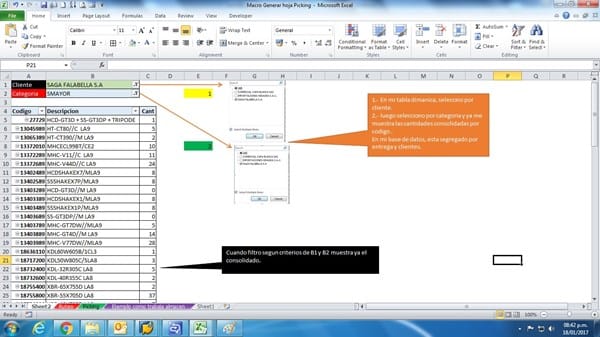 Lo que hago con mi archivo mediante una tabla dinámica es consolidar "Código - Descripción - Cant", como criterio de búsqueda tengo al cliente y su categoría (B1 - B2), lo que hace la T.D. Es sacarme cantidades consolidadas, por esos dos criterios.
