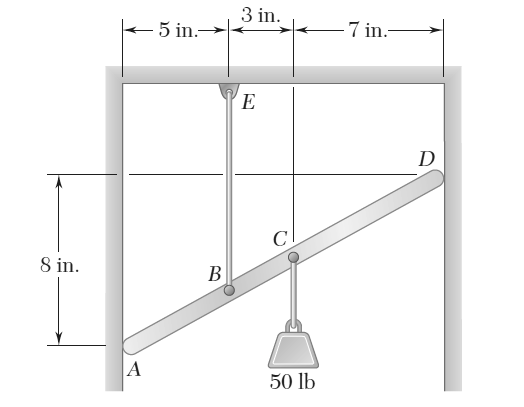 Una barra ligera AD se encuentra suspendida de un cable BE y sostiene un bloque de 50 lb en C. Los extremos A y D de la barra están en contacto con paredes verticales sin fricción, Determine la tensión en el cable y las reacciones en A y D.