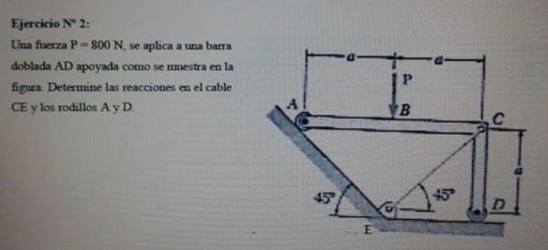 Primero cogemos el diagrama de sólido libre de la barra y hacemos sumatorio de fuerzas verticales, horizontales y momentos en el punto A, B, C y D. Con esto encontramos