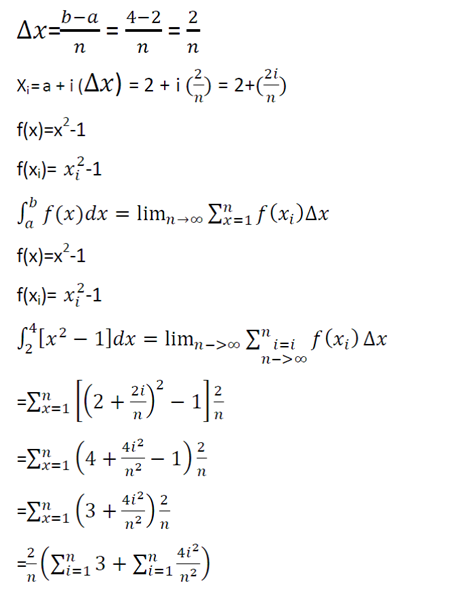 $$\begin{align}&\Delta= \frac{b-a} n=\frac {4-2} 2=2\\&\\&Abscisa \ del \ extremo \ derecho \ de \ cada \ subintervalo:\\&\\&x_i=a+\Delta x\\&\\&i\ indicaría \ el \ número \ del \ intervalo \ de\ izquierda \ a \ derecha\\&\\&x_i=2+i \frac 2 n\\&\\&La n-ésima \ Suma \ de \ Riemann:\\&\\& \sum _{i=1}^n f(x_i)· \Delta x= \sum _{i=1}^n f(2+i \frac 2 n)· \frac 2 n=\\&\\&\sum _{i=1}^n \Bigg[ \Bigg(2+2 \frac i n \Bigg)^2-1 \Bigg] \frac 2 n=\\&\\&\sum _{i=1}^n \Bigg[ \Bigg(4+ 8 \frac i n+4 \frac{i^2}{n^2} \Bigg)-1 \Bigg] \frac 2 n=\\&\\&las \ constantes \ salen \ fuera \ del \ sumatorio:\\&\\&\frac 2 n \sum _{i=1}^n \Bigg(3+8 \frac i n +4 \frac{i^2}{n^2} \Bigg)\end{align}$$