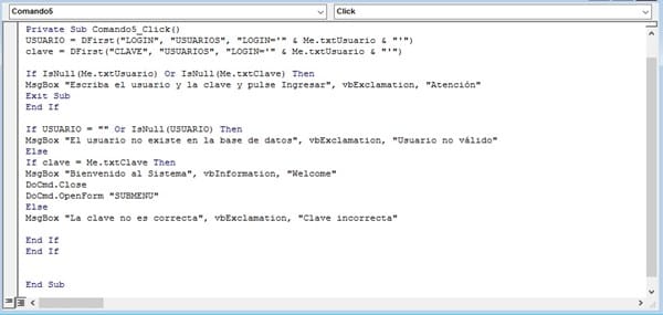 Ya casi he terminado una base de datos en la que he trabajado pero me pidieron que esta tuviera un menú con de claves administrador/usuario y que al acceder el administrador tuviera acceso a toda la base mientras que el usuario solo tenga acceso en modo lectura sin poder eliminar ni editar nada. Por ahora hice un menú en base a una tabla de usuarios y este al introducir la contraseña correcta me dirige a un submenú de pestañas que contienen todos los formularios, este es el código: