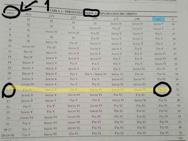 En el excel que me arme puse columnas donde tengo estos datos. Me gustaría saber cómo hacer o qué fórmula escribir para que cuando yo pongo la rta que dio el niño, por ej.: Fin VI, la columna de percentil se complete automáticamente recuperando esa info de la tabla del manual teniendo en cuenta la edad y la rta.