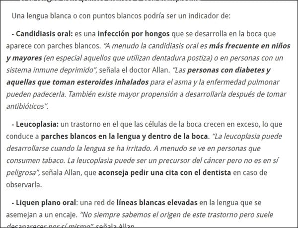 **Es posible que se trate de muget, una infección muy común provocada por un hongo llamado cándida, que se manifiesta en forma de manchas blancas en el interior de las mejillas, el paladar, la lengua y los labios.