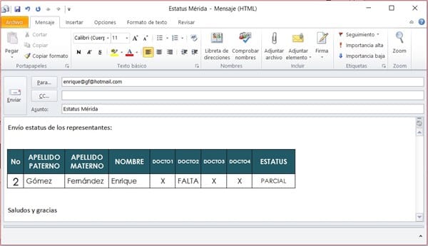 En la columna A tengo una lista de correos electrónicos y en las celdas a la derecha tengo información diferente de cada usuario. Mi petición es poder enviar al correo A2 la información de la celda B2, C2, D2, E2, F2, G2, H2 y con sus respectivos encabezados en B1, C1, D1, E1, F1, G1, H1 y así para cada correo sus celdas a la derecha con los encabezados de siempre. ¿Sería mucho pedir conservar el formato de excel 2010? Uso Outlook 2010