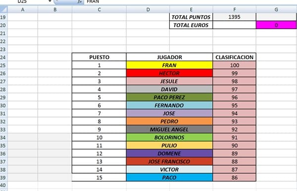 La columna clasificación se ordena de mayor a menor y quiero que los nombres vayan asociados a las celdas de clasificación que en este ejemplo están ordenadas . Ejemplo que si el valor de fran varia al ordenarse con nuevos valores se vaya el nombre con el.