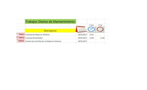 Tengo de ejercicio una planilla de tareas de mantenimiento diarias, yo he puesto como ejemplo las tareas de un día cualquiera, ya que no son las mismas todos los días y se repiten todos los meses. Necesito saber como seria el código para que cuando yo tilde la casilla de verificación ( en celda " A " )la descripción de las tareas ( fila " B " ) se coloree de ( Amarillo ) cuando la misma ha sido terminada y si esta en suspenso o no se realizo, la misma se coloree de (Verde y Rojo).