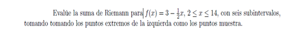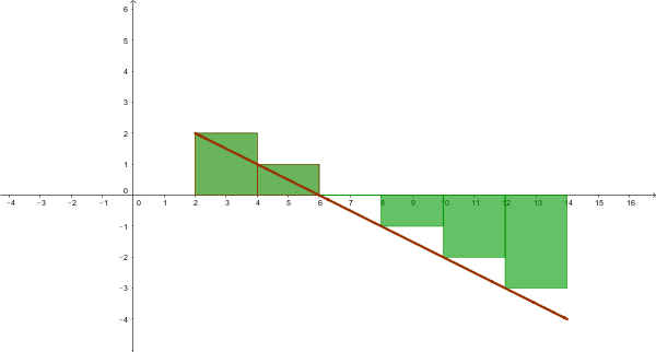 $$\begin{align}&\int_a^bf(x)dx \simeq \sum_{i=0}^{n-1} f(x_{i-1}) \Delta x= \Delta x \sum_{i=0}^{n-1} f(x_{i-1})\\&\\&\Delta x= \frac{b-a} n= \frac{14-2} 2=2\\&\\&intervalos:\\&[2,4] ==> f(2)=3- \frac 1 2 2=3-1=2\\&\\&[4,6] ==> f(4)=3- \frac 1 24=3-2=1\\&\\&[6,8] ==> f(6)=3 - \frac 1 2 6=0\\&\\&[8,10] ==> f(8)=3- \frac 1 28=-1\\&\\&[10,12]==> f(10)=-2\\&\\&[12,14] ==> f(12)=-3\\&\\&\int_2^{14}f(x)dx \simeq \sum_{i=0}^{5} f(x_{i-1}) \Delta x= \Delta x \sum_{i=0}^{5} f(x_{i-1})=\\&\\&\Delta x \Big[f(x_0)+f(x_1)+f(x_2)+f(x_3)+f(x_4)+f(x_5) \Big]=\\&\\&2 \Big[ 2+1+0+1+2+3 \Big]=2·9=18\\&\\&\end{align}$$