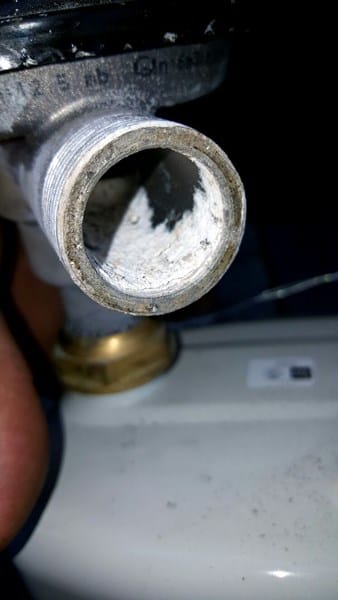 La instalación es nueva (2014) y al abrir fuera en el contador de gas nos encontramos polvo blanco en la pieza de la foto.. El instalador nos cambio la pieza y limpio la tubería. Igual en la caldera, se limpio y cambiaron piezas sucias.