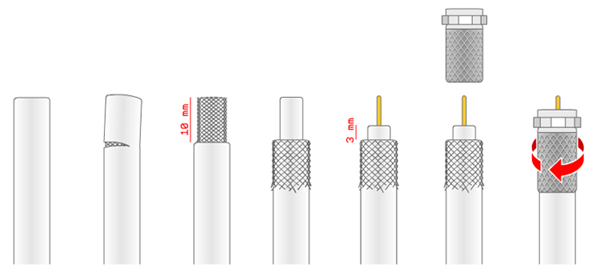Aqui una pequeña guia de cómo hacerlo cortar y pelar un cable coaxial y asi poder ponerle un conector tipo F
