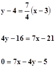 $$\begin{align}&m={-10-4\over-5-3}={-14\over-8} ={7\over4}\end{align}$$punto-pendiente