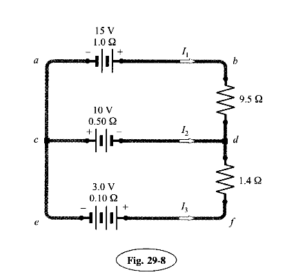 La diferencia de potencial, el voltaje en los puntos b y e es el mismo que c y b, y a y b, entonces como puedes ver en mi diagrama en esa rama está la fuente y una caída de potencial en su resistencia interna (que yo la dibujo aparte), entonces es restarlas y te da la respuesta.
