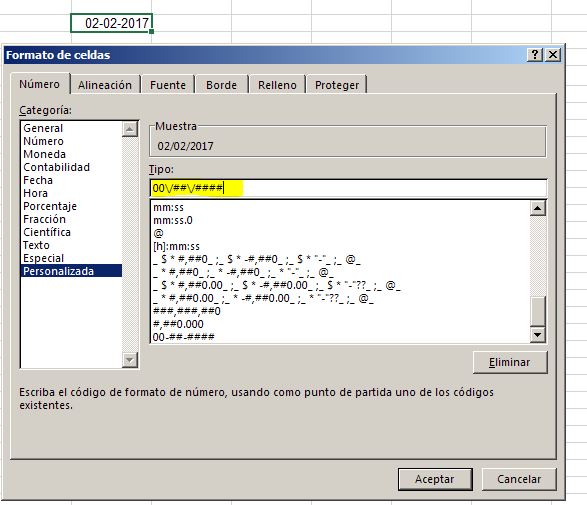 Quiero introducir en una celda la fecha sin poner las barras. Por ejemplo, teclear 02022017 y que Excel lo reconozca y ponga 02/02/2017.