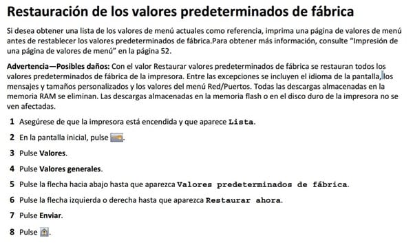 Escribo para mirar si alguien me ayuda a Restaurar a Valores de Fabrica Impresora Lexmark x466. Lo que pasa, es que me obsequiaron esta impresora y lo que pasa es que tiene unas configuraciones personalizadas como el nombre de una empresa y unas configuraciones de Red. He hecho algunas opciones que están en el panel de la impresora para Restaurarla y uno ve que hace el proceso de restaurar y nada. Al iniciar nuevamente la impresora esta sigue igual con esas configuraciones personalizadas y no se como borrarlas. Si alguien sabe como.