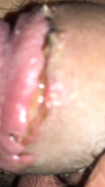 En cuanto a lo tuyo, a pesar de que no tengo conocimiento médico como tal, ¿has pensado si pudiese ser orina? En plan que al ir a orinar, quedasen restos que se juntasen con los otros líquidos del glande, y quedase depositada ahí. En ese caso, supongo que sería cuestión de aplicar agua (dejando caer, no a presión) sobre esa zona y secar con gasas.