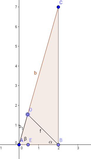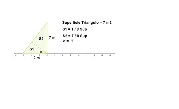 La pregunta dice : El siguiente triángulo tiene una superficie de 7 m2, cuanto vale el ángulo "alpha"( no se como se coloca el signo ), tal que la recta punteada que divide la gráfica en S1 = 1/8 Sup. Y S2 = 7/8 sup.