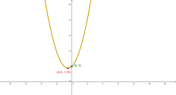 $$\begin{align}&y=1x^2+1x+2\end{align}$$Necesito saber: a) Dominio, b) Recorrido. C) De forma aproximada los intervalos de crecimiento y decrecimiento. D) Punto de corte con los ejes. E) Asíntotas si las hubiese. F) Puntos máximos y mínimos que representa. G) Límite de la función cuando x tiende a infinito. H) Límite de la función cuando x tiende a un valor concreto( a elegir)