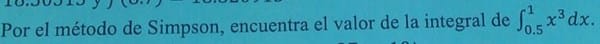 $$\begin{align}&\int_ \frac 1 2^1 x^3 dx\simeq \frac h 3 \Big[f(x_0)+4 f(x_1)+f(x_2) \Big]\\&\\&h= \frac{b-a} n=\frac{1-0.5} 2=\frac 1 4\\&\\&x_0= \frac 1 2\\&\\&x_1= x_0+h= \frac 1 2+ \frac 1 4= \frac 3 4\\&\\&x_2=x_1+h= \frac 3 4+ \frac 1 4=1\\&\\&\int_ \frac 1 2^1 x^3 dx\simeq \frac 1 {12} \Big[f(\frac 1 2)+4 f(\frac 3 4)+f(1) \Big]=\\&\\&\frac 1 {12} \Big[( \frac 1 2)^3+4( \frac 3 4)^3 +1^3 \Big]=\\&\\&\frac 1 {12} \Big[ \frac 1 8+ \frac {27}{16}+1 \Big]= \frac {15}{64}\\&\\&\end{align}$$Saludos