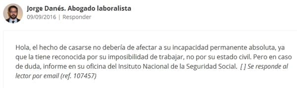 Tengo una invalidez absoluta y cobro una gran invalidez, mi pareja ha empezado a trabajar hace unos meses, mi pregunta es si se vería afectada y de qué forma, la cuantía de mi pensión en caso de contraer matrimonio. Vivo en Madrid.