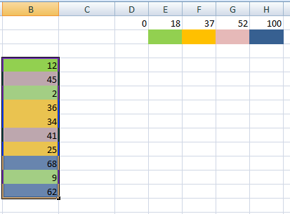 Como notarás, esa fórmula que coloqué en la casilla (en amarillo) evalúa el color a asignar cuando el contenido de la celda supere el "piso" para ese color.