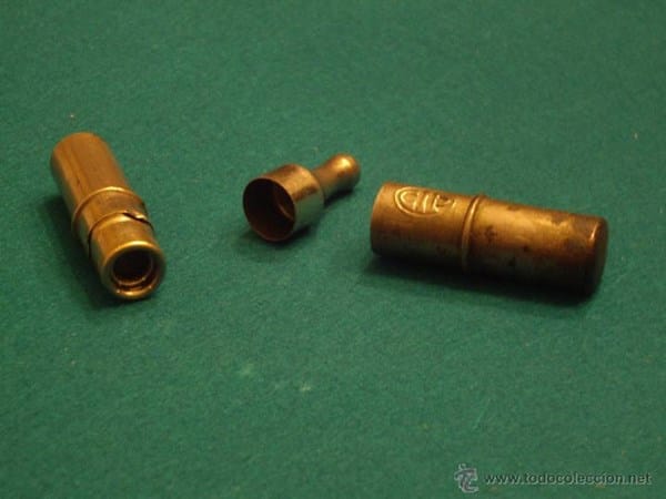 Estaba hurgando en el sótano ya abandonado de mi abuelo cuando me fijé en un pequeño objeto cilíndrico y metálico del tamaño de un dedo aproximadamente. Este cilindro se puede abrir y dentro tiene un pequeño aparato de un tamaño similar, con forma de boquilla de cachimba, ¿podría ser una boquilla para fumar cigarros? En el exterior tiene grabadas las leyendas "CIP" y D.R.G.M. ¿Alguien sabe qué es en realidad y de qué época?