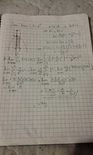 Dice así: la región sobre el eje X y a la derecha de la recta X=1 limitada por el eje X, la rectas x=1 y la curva y=4-x^2 según el resultado debe ser 5/3