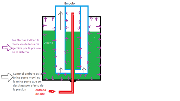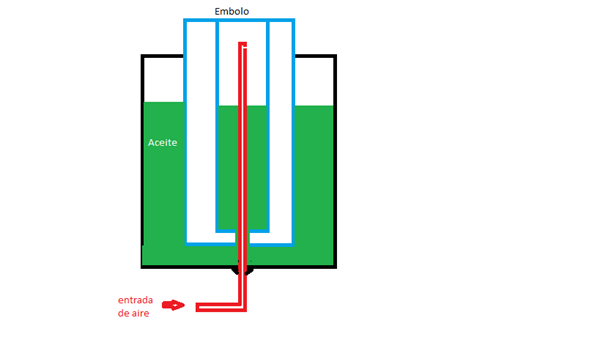 Este es un cilindro tipo embolo de simple efecto, que contiene aceite en su interior en otro cilindro de menor diámetro dentro del mismo embolo que se comunica con la camisa