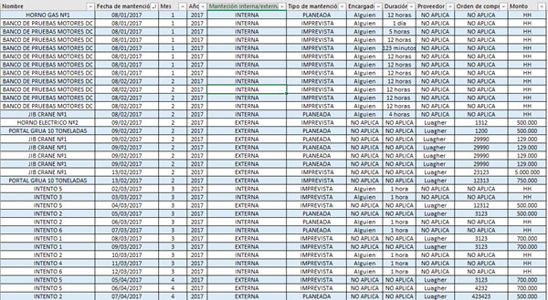 - Arrastra las etiquetas "Año", "Mes", "Tipo de Mantención" al área de FILAS.