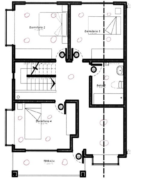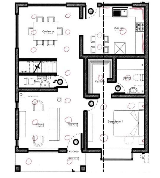 Esto es un bosquejo de la posición de los leds empotrados que quiero colocar en mi casa, pero tal vez sobrará o faltará alguno, tengo en mente utilizar ampolletas de GU10 de 4w u 8w con ángulos de apertura de 120° y 100° respectivamente (cuál me recomiendan) mezclaré luz fría y cálida.