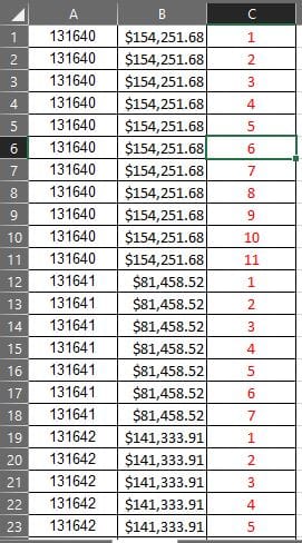 Tengo este archivo los números cambian con cada mes quisiera enumerarlos como aparecen en rojo(columna C) y enumerarlos de acuerdo a las veces que aparecen en la columna A