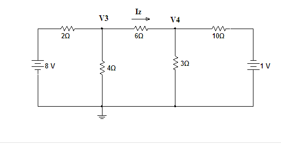 V3= +4.56 Volts ................................V4= +1.10 Volts.....................Iz =(4.56 - 1.10) / 6 = 0.576 A.