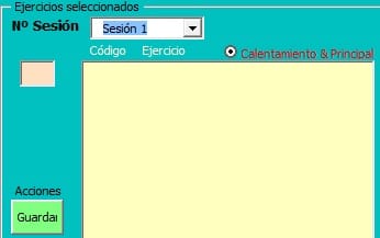 Los registros de cada una de las planillas son llevados a cabo mediante un userform, con un filtro, y a partir de una lista generada se guarda en la planilla que he seleccionado a través del combo (cmbSesión) (en la imagen se ve ya el listbox con los ejercicios que serán cargados a la hoja, y en este caso a la planilla referente a la sesion1, en el caso no hay ninguno)
