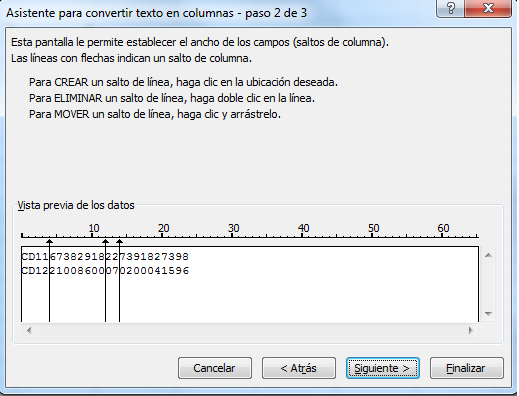 Tengo en un celda una serie de números y letras y necesitaría separarlo en varias celadas, por ejemplo en la columna E de mi excel tengo CD1221008600070200041596 y necesitaría que fuera así: